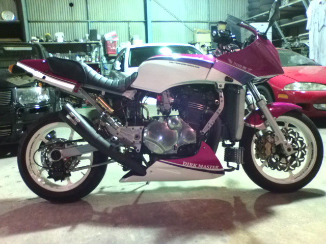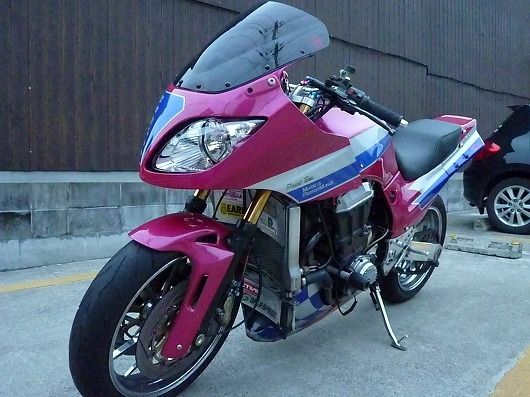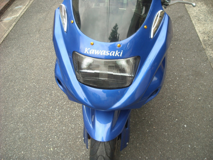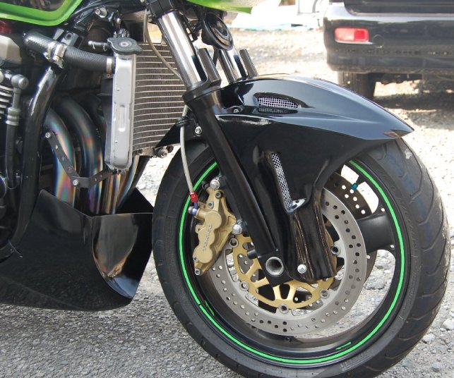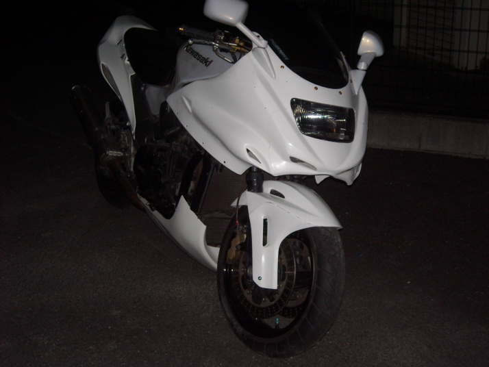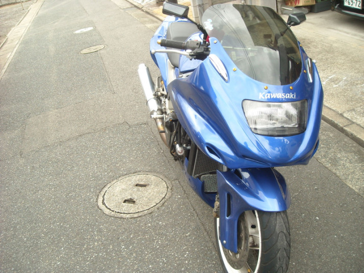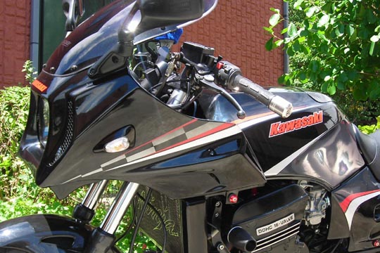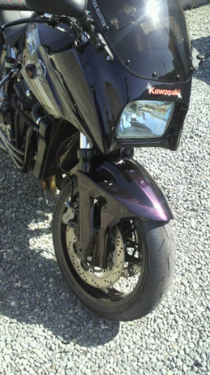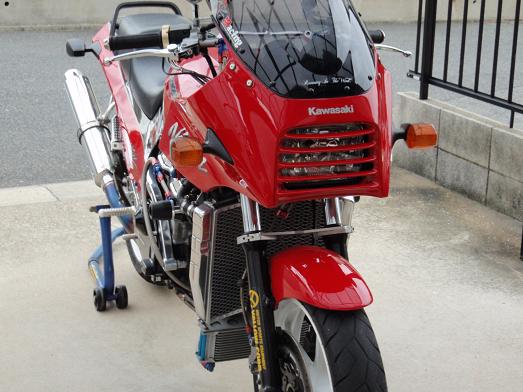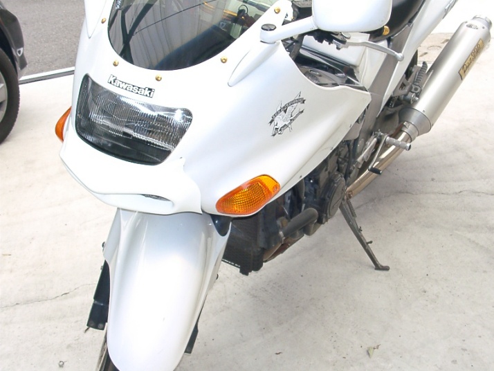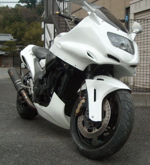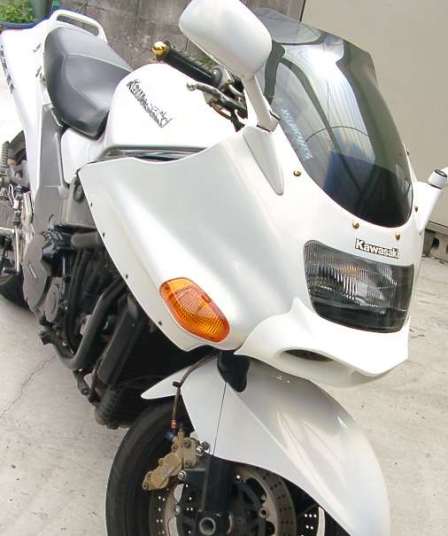 ※GPZ900R専用カウルですが、Y様自らのカウルステー加工によりZRX1200に装着させております。 |